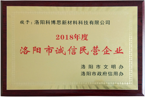 近日,由市文明辦與市政府信用辦舉辦的《洛陽市2018年度“誠(chéng)信經(jīng)營(yíng)企業(yè)”和“誠(chéng)信建設(shè)先進(jìn)個(gè)人”評(píng)選活動(dòng)》,經(jīng)推薦遴選和嚴(yán)格評(píng)審,洛陽科博思新材料科技有限公司被授予“誠(chéng)信民營(yíng)企業(yè)”榮譽(yù)稱號(hào)。